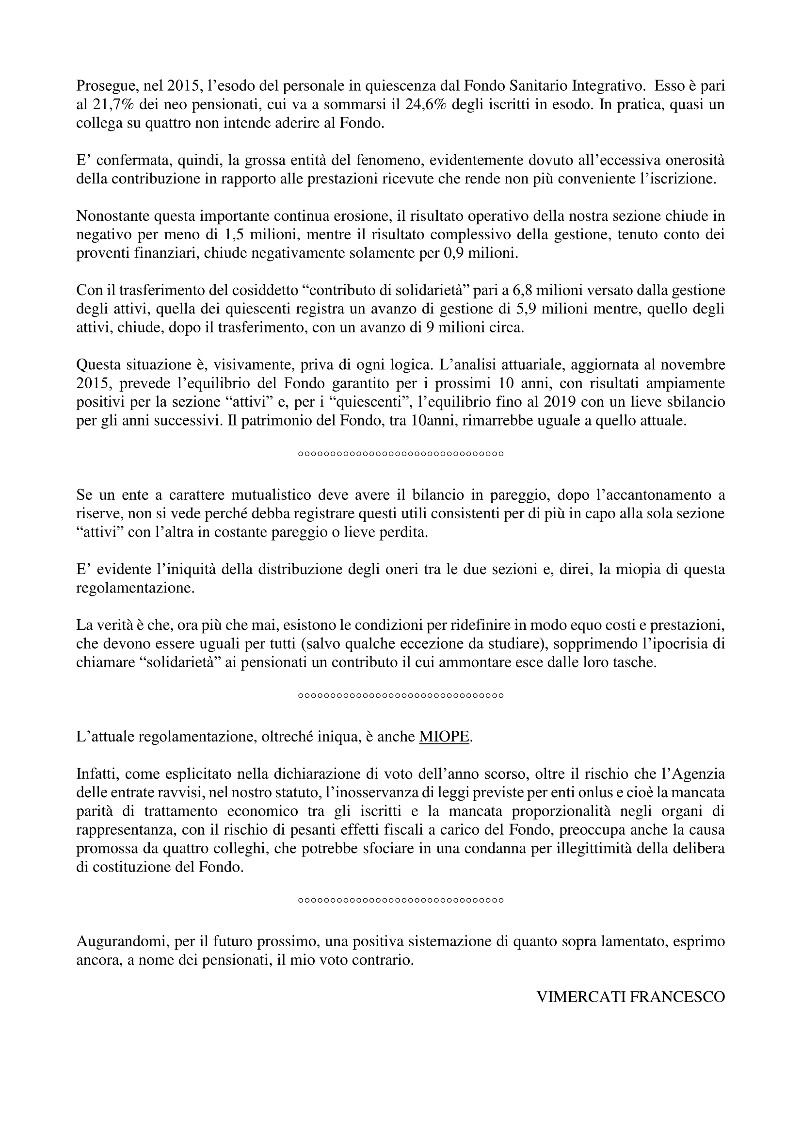 Pubblichiamo integralmente la dichiarazione di voto del Dr. Vimercati Francesco in occasione dell'Assemblea dei Delegati del 23/06/2016 del Fondo Integrativo Gruppo Intesa Sanpaolo.