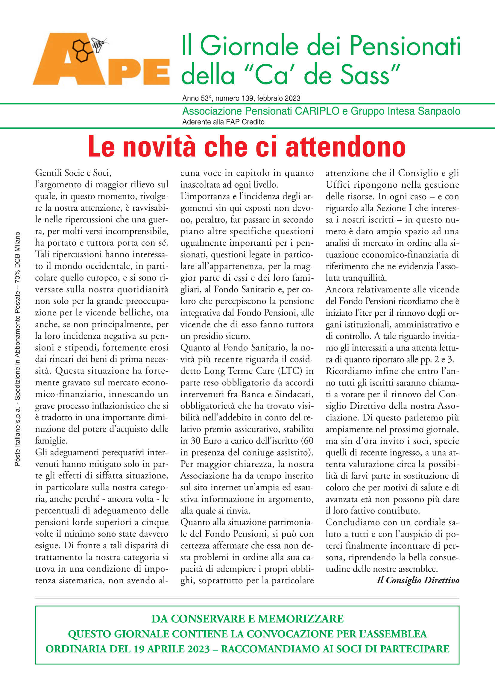 GIORNALE DEI PENSIONATI DELLA "Cà de Sass" N° 139