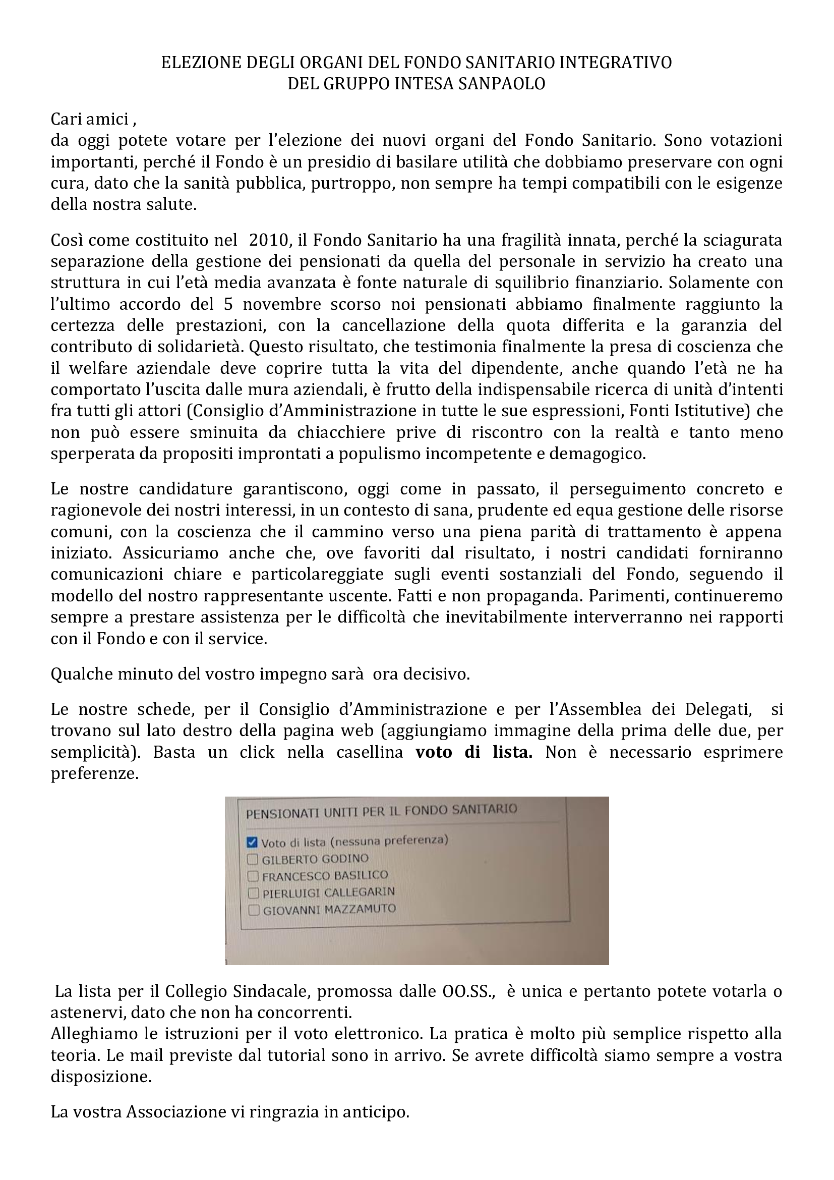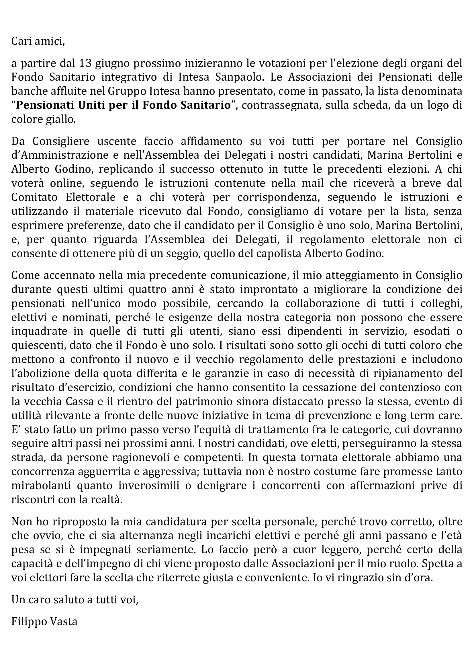 APPELLO DEL DOTT. FILIPPO VASTA PER LE ELEZIONI DEGLI ORGANI SOCIALI DEL FONDO SANITARIO INTEGRATIVO DI INTESA SANPAOLO.