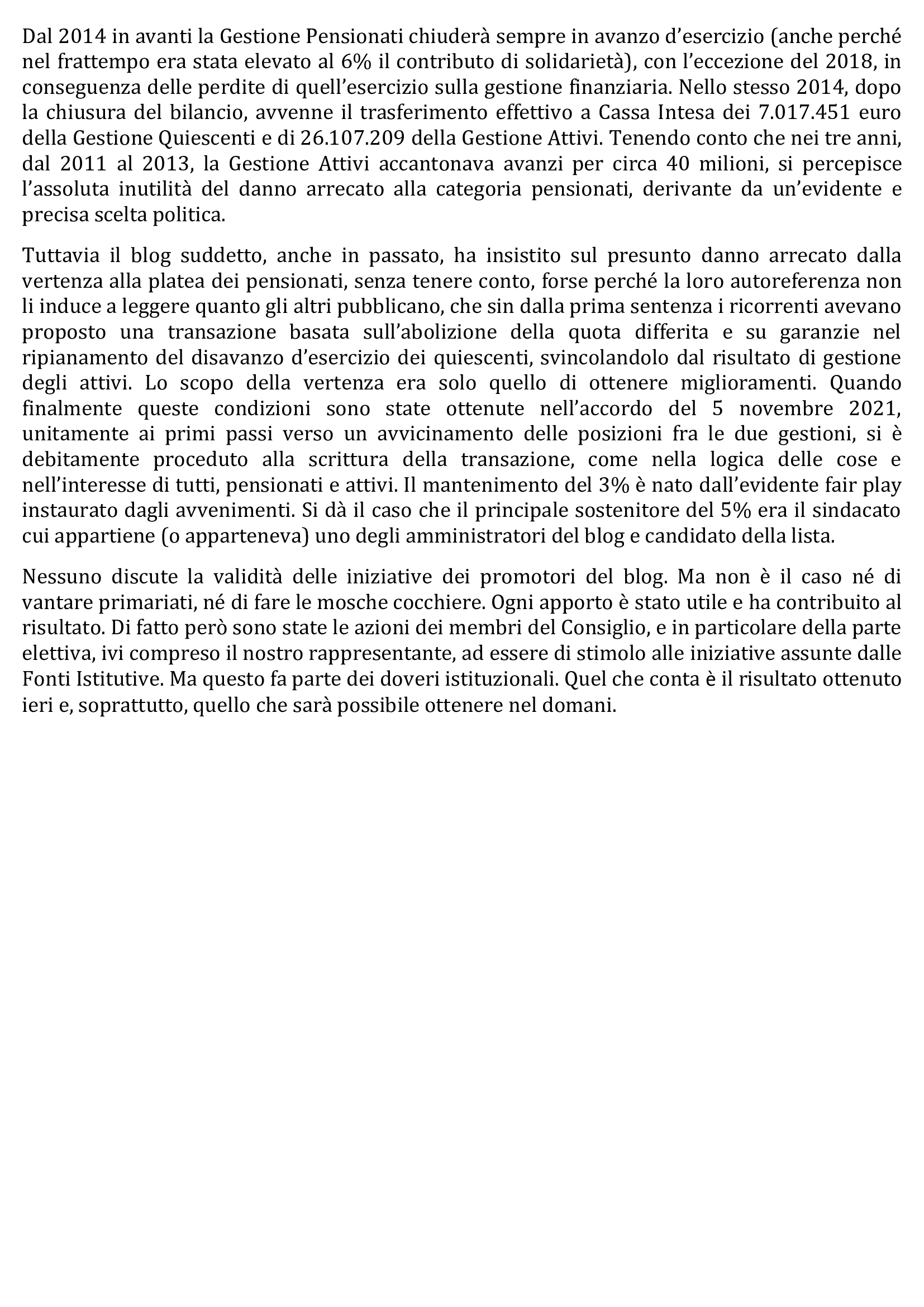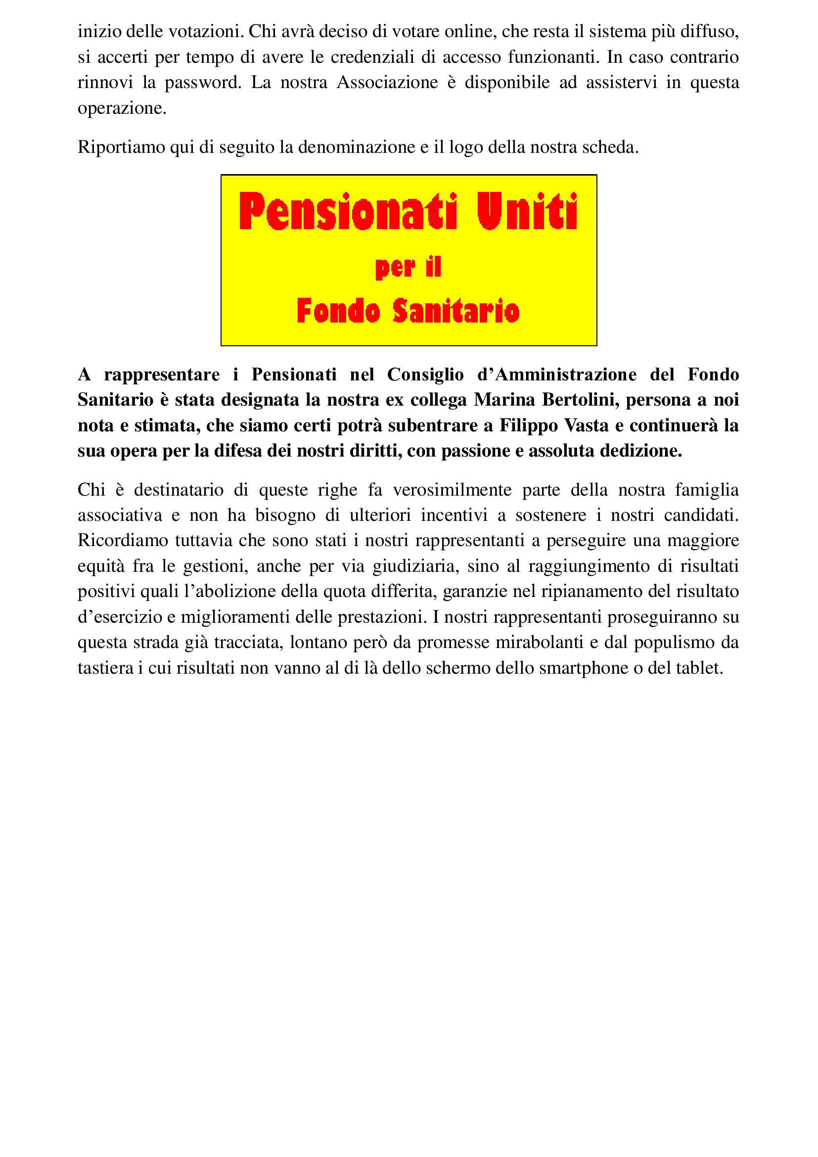 Vogliamo ringraziare, infine, la saggezza e l'intelligenza del nostro Rappresentate nell'attuale Consiglio di Amministrazione, Signor Filippo Vasta, al quale va ascritto il merito, in condizioni assolutamente disagevoli essendo l'unico consigliere a rappresentare i pensionati, di aver svolto l'incarico con la competenza e l'abnegazione che gli vengono unanimemente riconosciute. Analogamente dobbiamo riconoscenza al Signor Gilberto Godino, che si ripresenta, per l'attività svolta quale nostro rappresentante dei Pensionati nell'Assemblea dei Delegati, sempre presente nelle riunioni di detto Organismo, nonostante il discredito di parte avversa che lo ha confuso con l'altro rappresentante, di espressione sindacale, mai visto in dette riunioni.