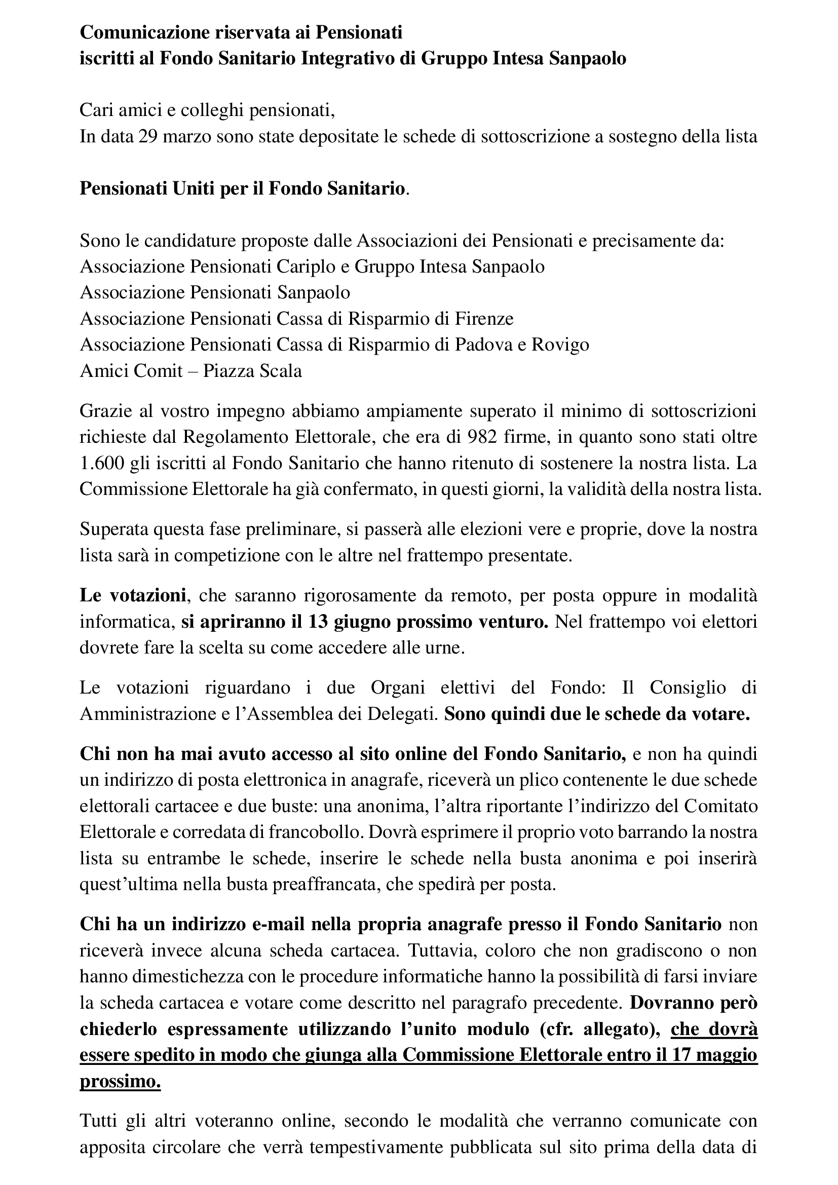 Siamo certi che i nostri iscritti, unitamente a quelli dell'Associazione Amici Comit Piazza Scala, a quelli dei Pensionati San Paolo di Torino, a quelli delle Associazioni Pensionati della Cassa di Risparmio di Padova e Rovigo, a quelli dell'Associazione Pensionati della Cassa di Risparmio di Firenze e, infine, a quelli dell'Associazione Pensionati della Cassa di Risparmio di Venezia, privilegeranno le liste comuni, denominate "PENSIONATI UNITI PER IL FONDO SANITARIO".