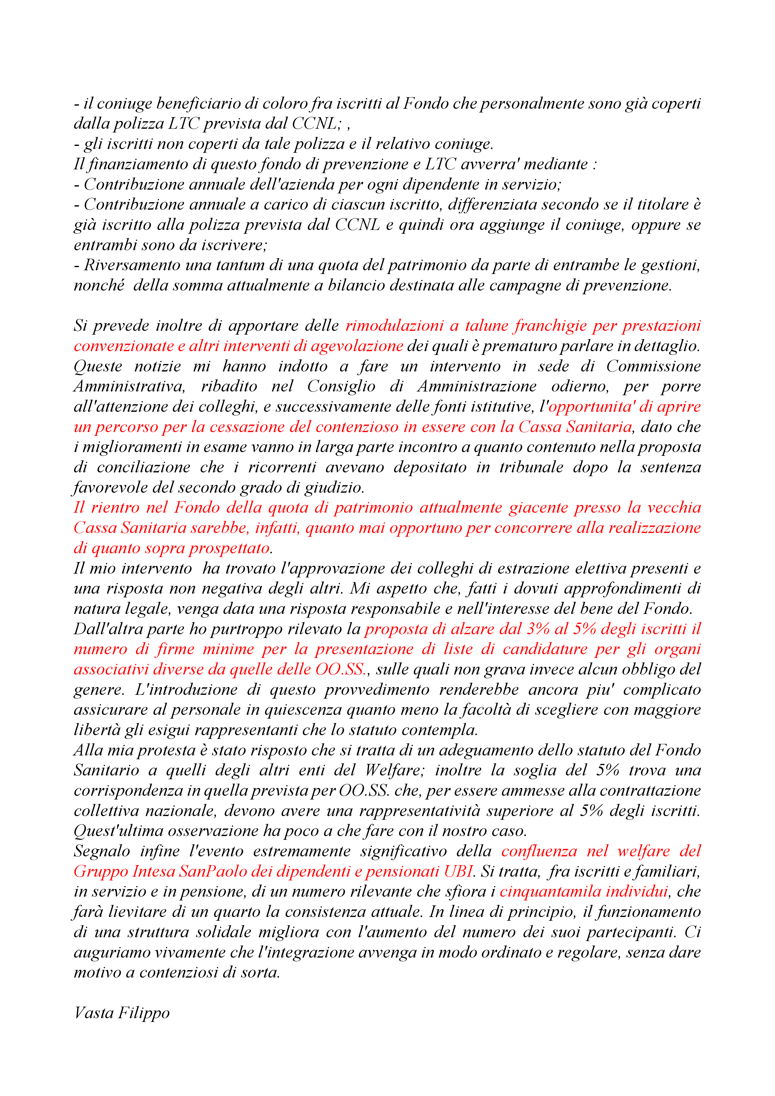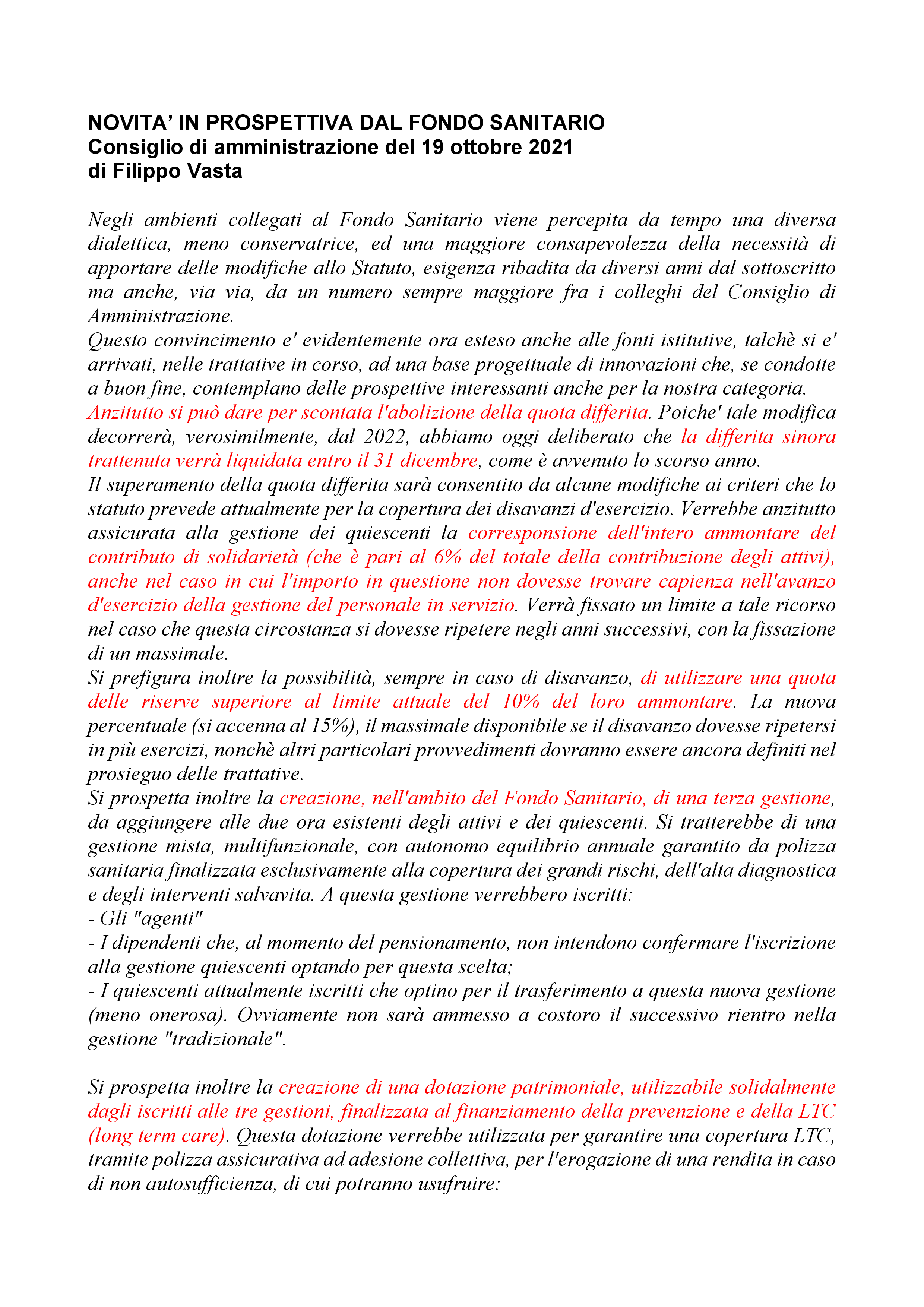 Si riporta qui di seguito la relazione del dr. FilippoVasta, nostro rappresentante nel Consiglio del Fondo Sanitario Integrativo in relazione alla discussione intervenuta nell'ultima riunione consigliare del 19 ottobre 2021.