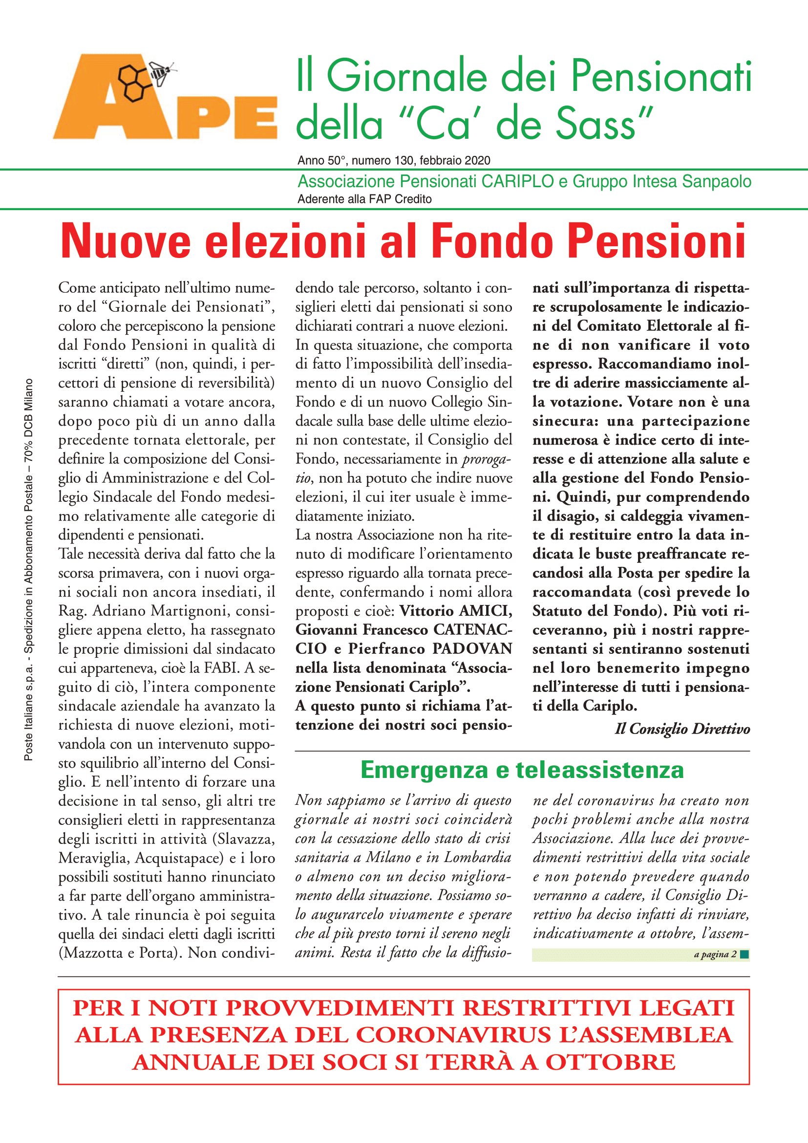 In relazione al perdurare della situazione critica che investe il nostro Paese a causa della nota pandemia, con restrizioni di movimento che ne conseguono, L'ufficio Elettorale Centrale del Fondo Cariplo ha emanato la circolare n° 3 che dovrebbe giungere a ciascuno di Voi, ma che comunque verrà pubblicata anche sul sito del Fondo, con la quale è stato deciso di prorogare al 29 maggio prossimo il termine entro il quale le schede elettorali devono giungere al Comitato Elettorale anzidetto.