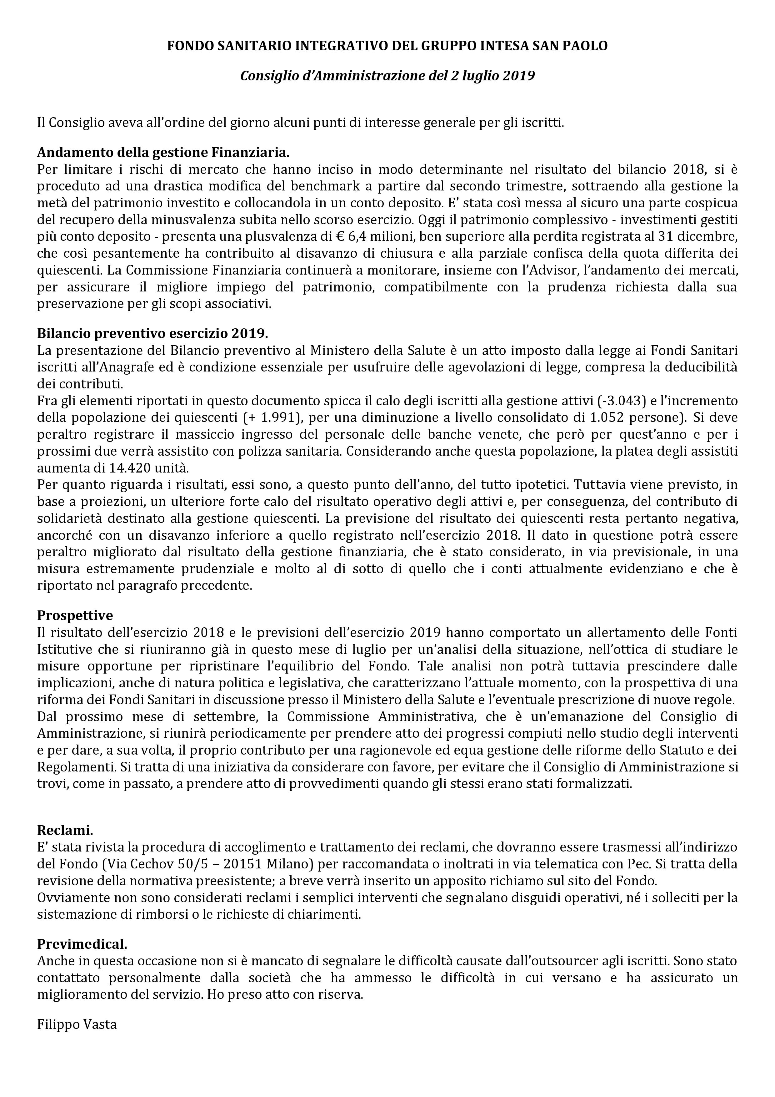 Relazione del nostro Consigliere nel FONDO SANITARIO INTEGRATIVO - GRUPPO INTESA SANPAOLO, dr. FILIPPO VASTA in ordine all'ultimo Consiglio Direttivo.
