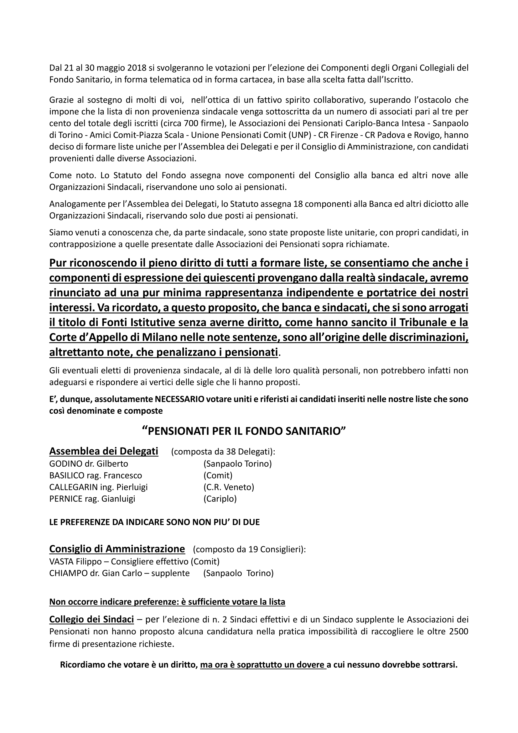 Tuttavia, la loro professionalità e competenza, indiscutibili, non mancheranno di far emergere, in seno ai rispettivi Organi, le incongruenze e le contraddizioni che ormai da anni penalizzano la nostra categoria, così come non mancheranno di portare avanti importanti istanze sulle differenze di trattamento fra attivi e pensionati (differenti contribuzioni per persone a carico e non dei pensionati, quote differite, franchigie e quant'altro) derivanti da prepotenza e arroganza di chi non conosce le più elementari regole della democrazia che dovrebbero essere la norma in una comunità, in seno alla quale andrebbero riconosciuti a tutti medesimi diritti.